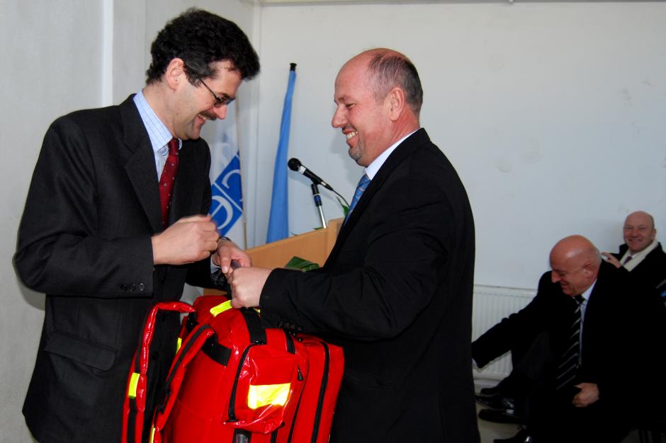 Ambassador Werner Almhofer (l), Head of the OSCE Mission in Kosovo, hands over OSCE-donated first aid bags to Haki Dragusha, from the Ambulance Services in Prishtine/Pristina, 9 March 2009.