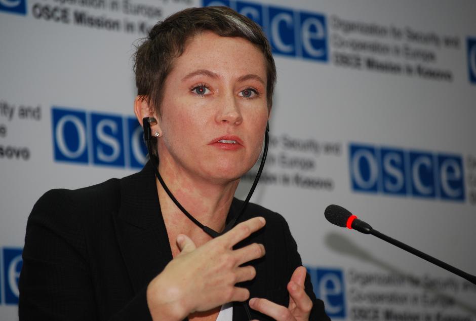 OSCE Mission in Kosovo Legal Adviser, Emily Patterson, answers a journalist's question at a press conference to announce the release of a report on disputes over immovable property rights, Prishtine/Pristina, 6 April 2009.