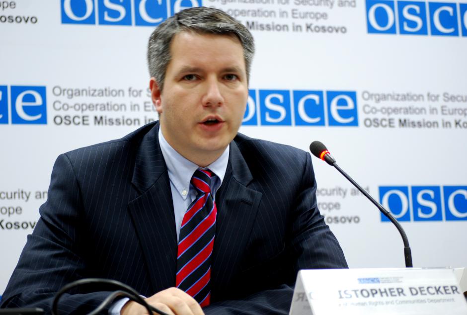 Christopher Decker, Director of the Mission in Kosovo's Human Rights and Communities Department, speaks at a press conference announcing the release of a report on disputes over immovable property rights in Kosovo, Prishtine/Pristina, 6 April 2009.
