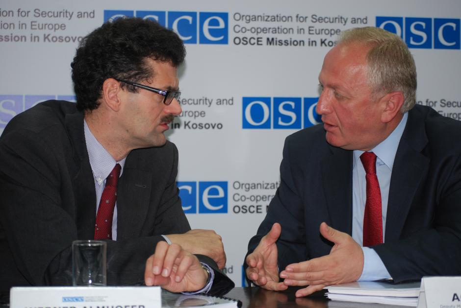 Ambassador Werner Almhofer (l), Head of the OSCE Mission in Kosovo and Kosovo's Minister of Education, Agim Hyseni discuss the Mission's report on non-majority communities in the Kosovo education system, Prishtine/Pristina, 29 April 2009.