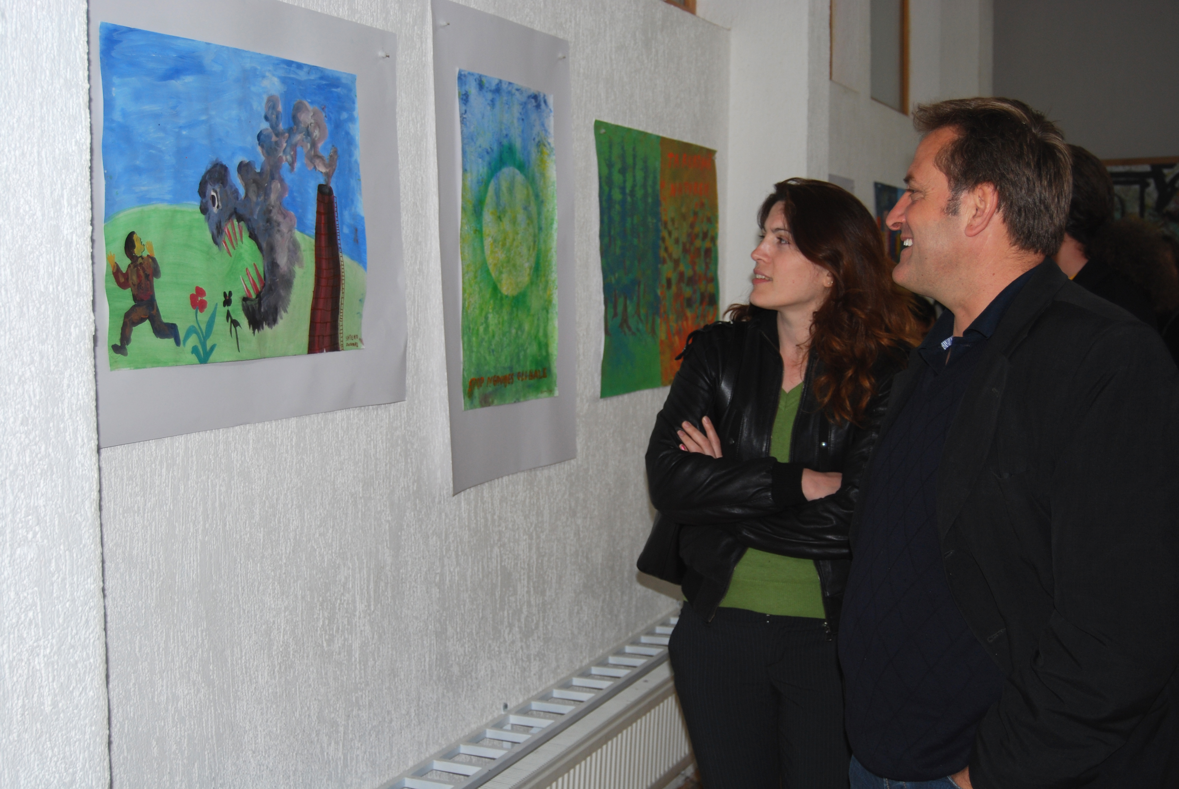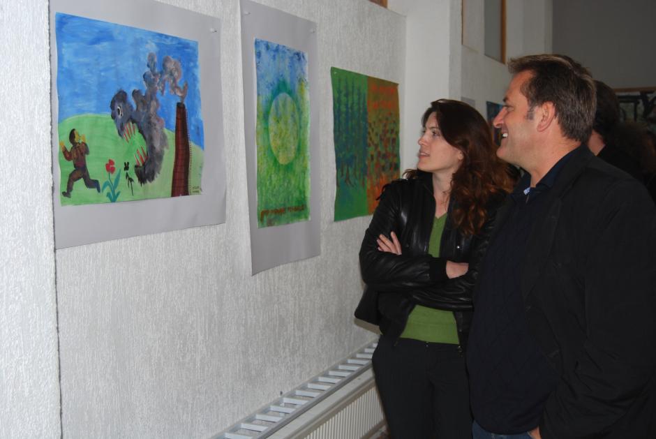 Salih Elshani and Violeta Demaj of the OSCE municipal team in Suharekë/Suva Reka municipality at an exhibition of drawings by the students of Jeta Re secondary school, part of the Kosovo Mission's activities to mark Earth Day, 22 April 2009.