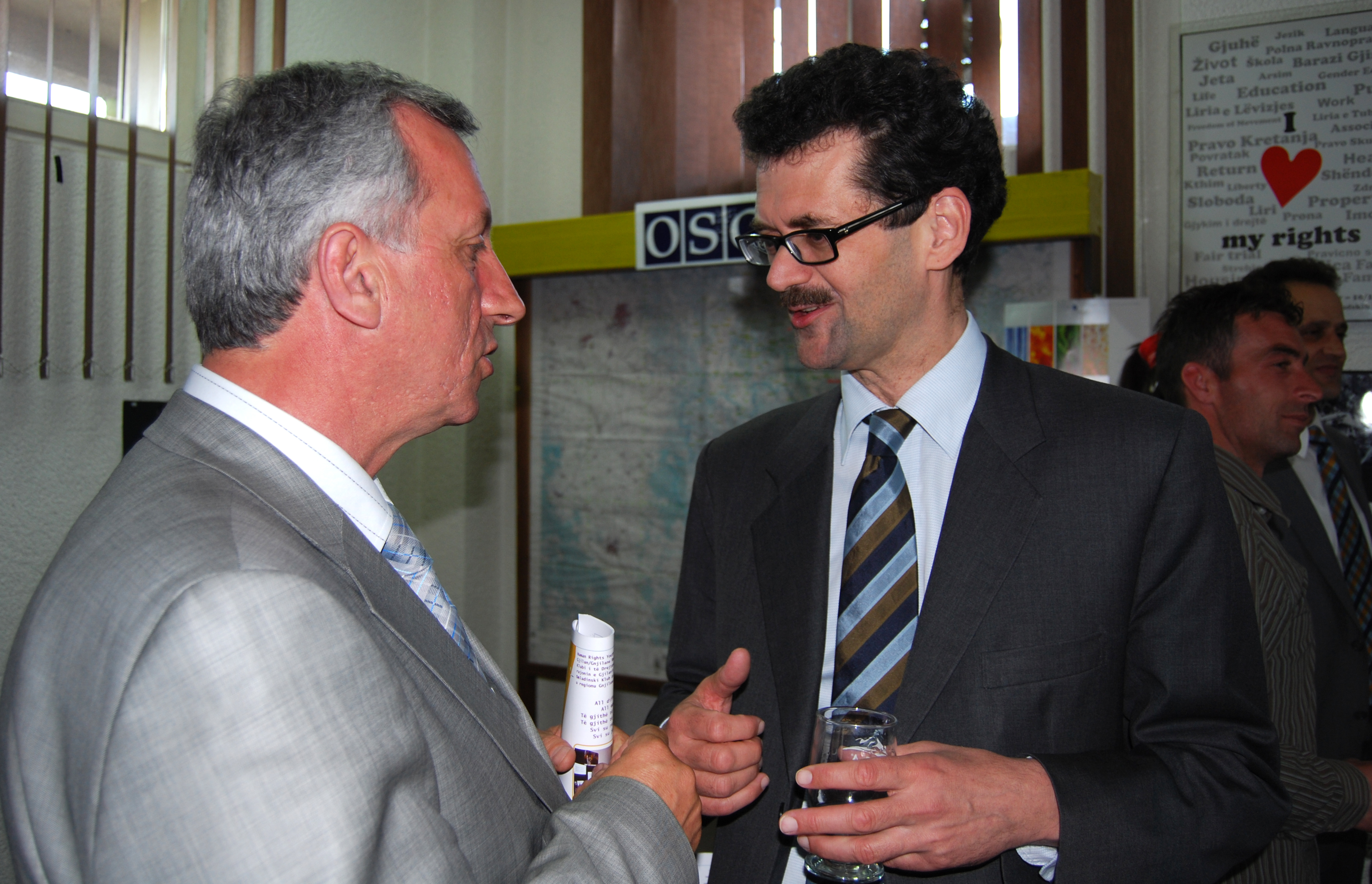Head of the OSCE Mission in Kosovo, Werner Almhofer (r), meets the Mayor of Gjilan/Gnjilane municipality, Qemajl Mustafa, at a photo exhibition organized by members of the Human Rights Club from Gjilan/Gnjilane and supported by the Mission, 27 April 2009.