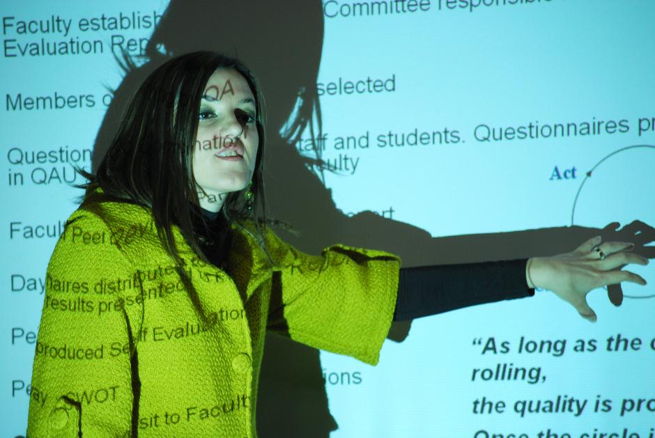 Mimoza Ibrani, Director of the Academic Development Office at the University of Prishtina explains the Mission-supported process of quality assurance in teaching practices in a seminar held at the University, Prishtine/Prstina, 17 December 2008.