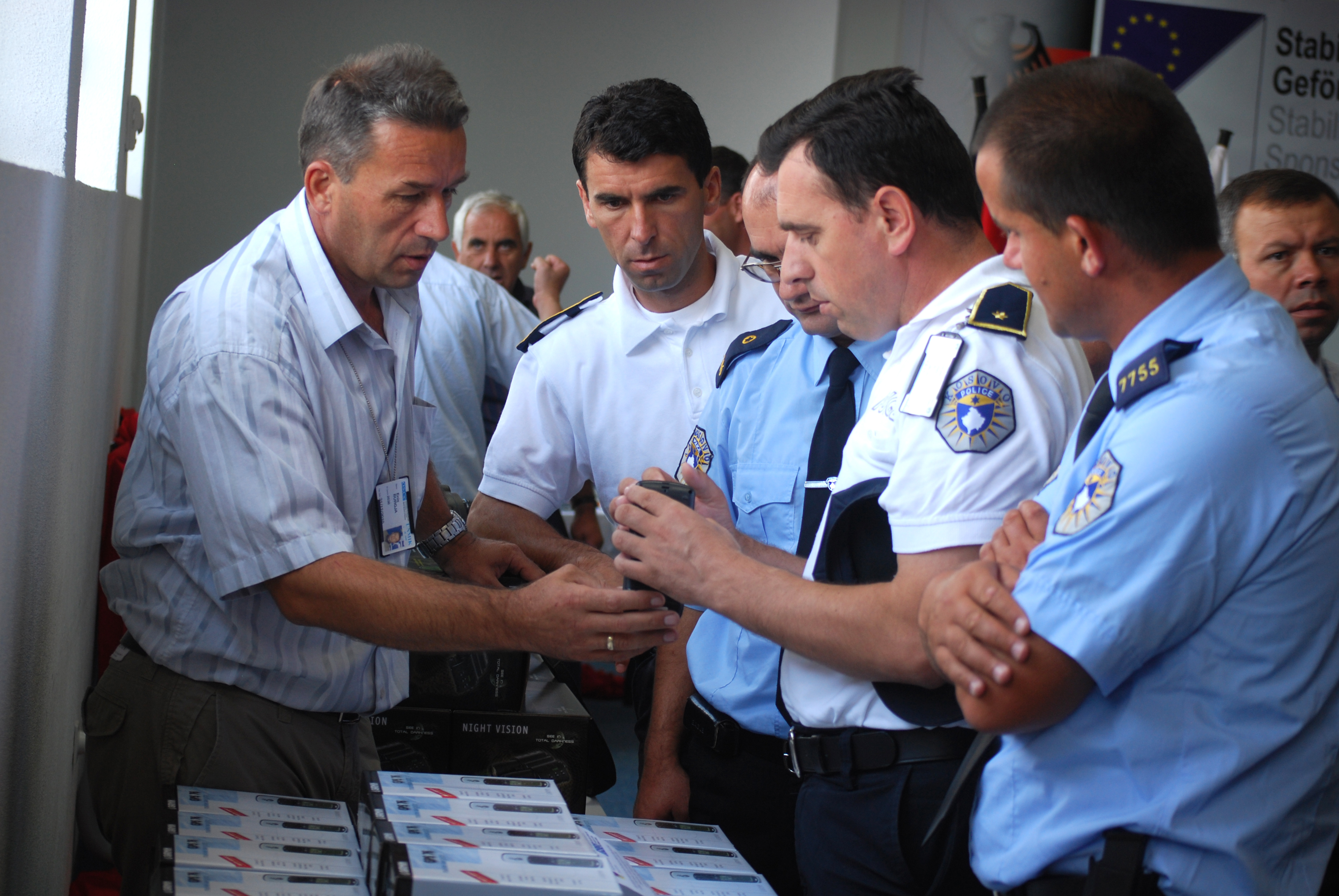 Kosovo police officers look at night vision devices at a handover ceremony for equipment donated by the German Embassy to the Security and Public Safety Agency in Kosovo, Vushtrri/Vucitrn, 20 July 2009.