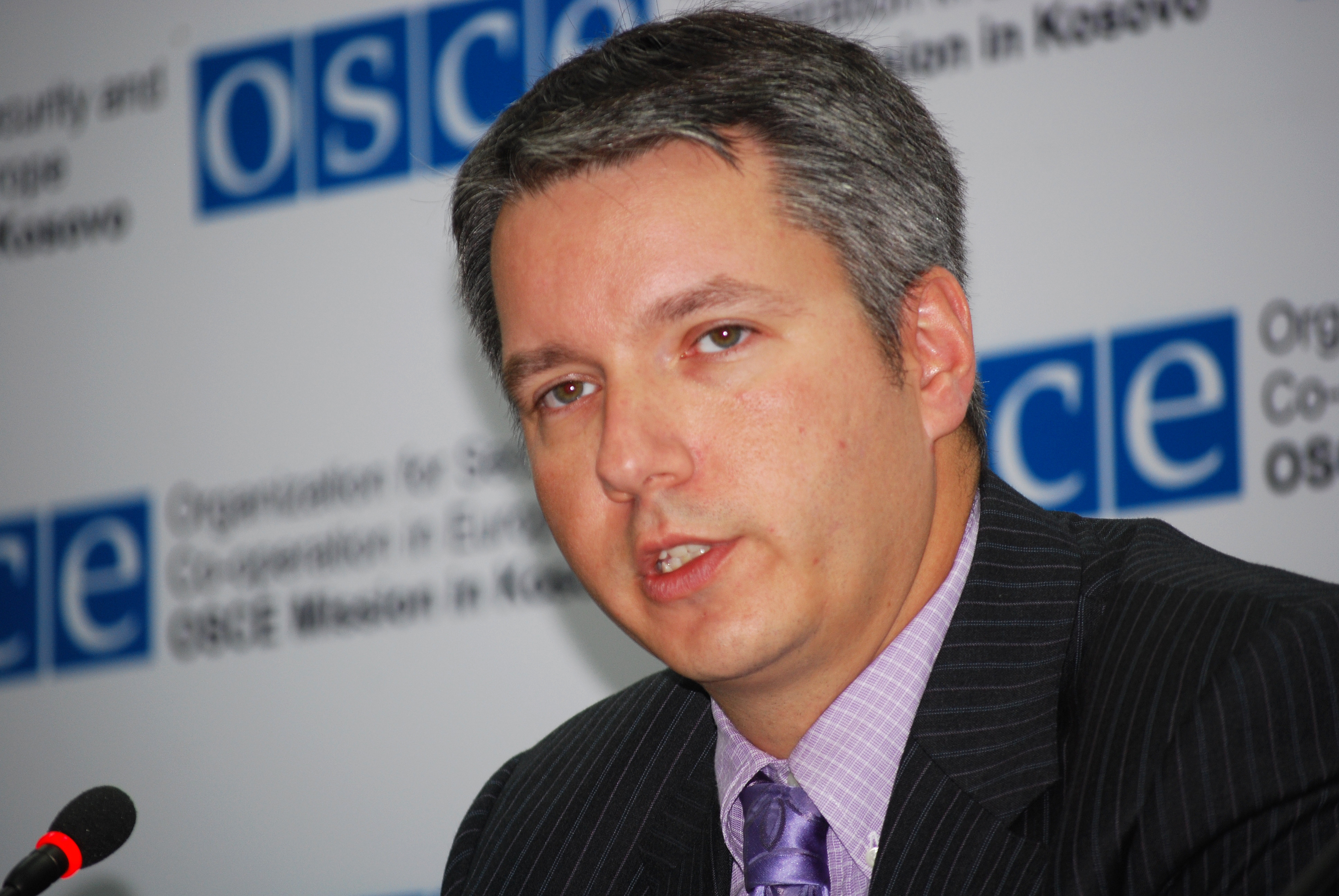 Christopher Decker, Director of the Kosovo Mission's Human Rights and Communities Department, speaks at a press conference in Prishtine/Pristina on a new OSCE report on fraudulent property transactions in the Peje/Pec region, 3 September 2009.
