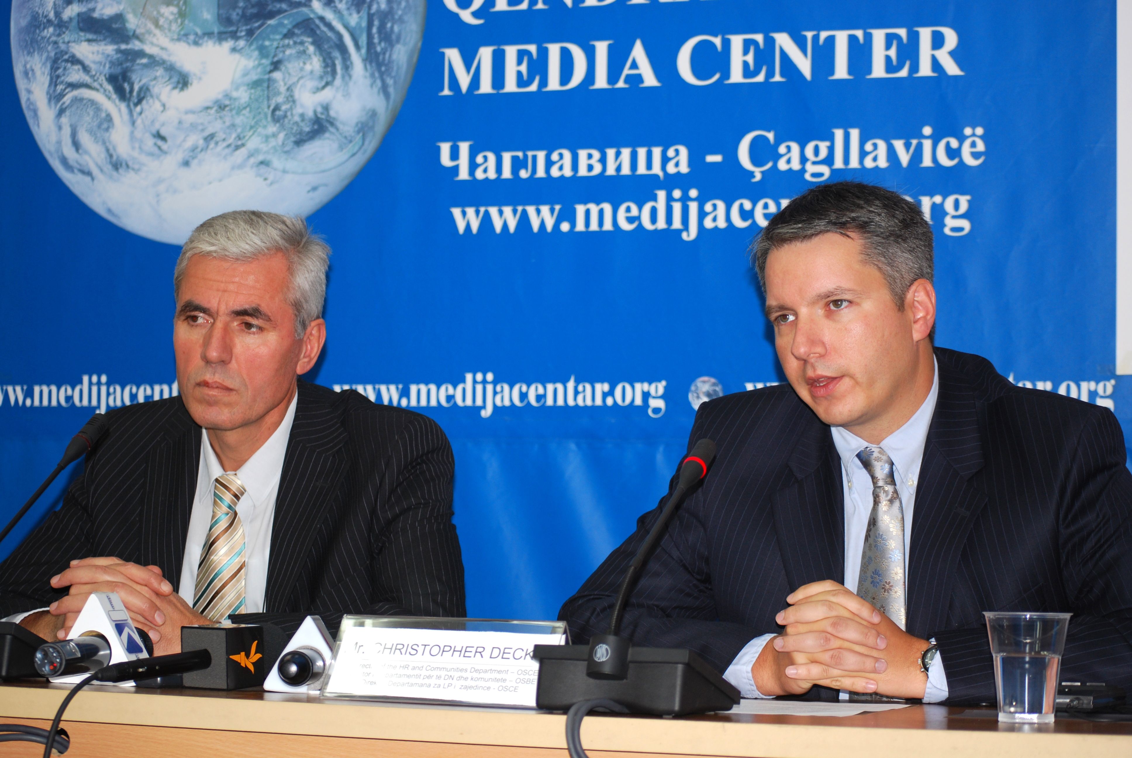 Christopher Decker, Director of the OSCE Mission in Kosovo's Human Rights and Communities Department (r), and Sami Kurteshi, Kosovo's first local Ombudsperson, during a joint press conference at the media centre in Gracanica/Gracanice, 8 September 2009.