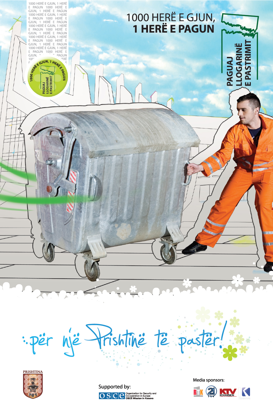 This campaign image for a city light calls on the public to pay their garbage-collection bills with the message "1000 times to throw, one bill to pay: pay the garbage-collection bill." The slogan is "...for a clean Pristina!"