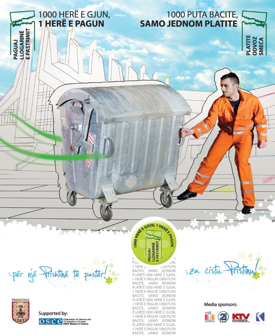 This newspaper campaign advertisement calls on the public to pay their garbage-collection bills with the message "1000 times to throw, one bill to pay: pay the garbage-collection bill." The slogan is "...for a clean Pristina!"