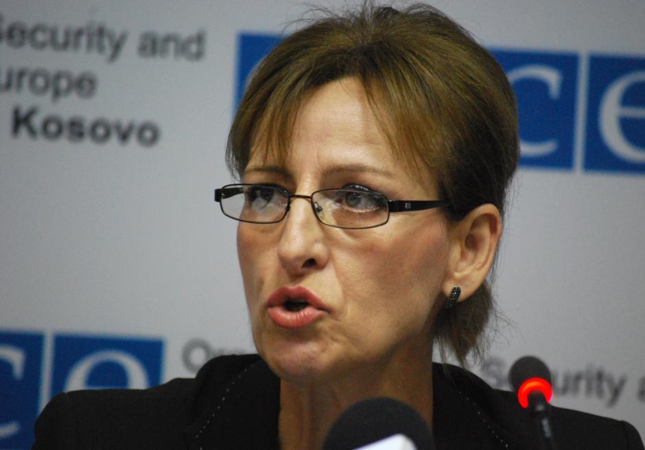 Makifete Saliuka, a civil judge at the municipal court of Prishtine/Pristina, explains court proceedings of domestic violence cases at a press conference organized by the OSCE Mission, 25 November 2009.