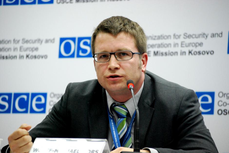 Michael Mors, deputy director of the OSCE department for human rights and communities, explains the Mission's involvement to the media at the launch of an OSCE-sponsored campaign to combat trafficking in human beings, Prishtine/Pristina, 26 November 2009.