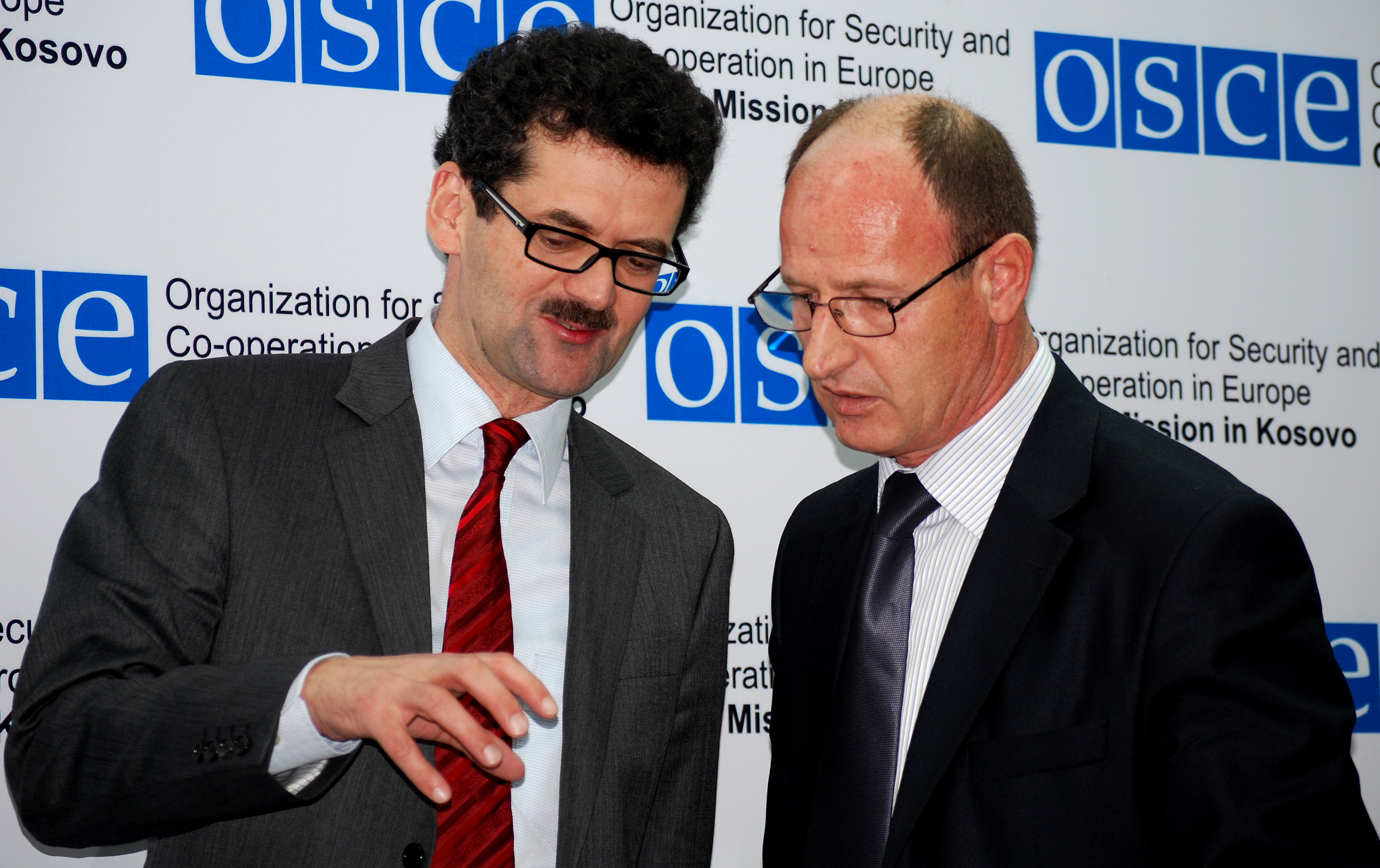 Head of the OSCE Mission in Kosovo Werner Almhofer (l), and Sadri Ferati, Minister of Local Government Administration, discuss the Mission's report on the participation of non-majority communities in the municipal structures, Pristina, 3 December 2009.