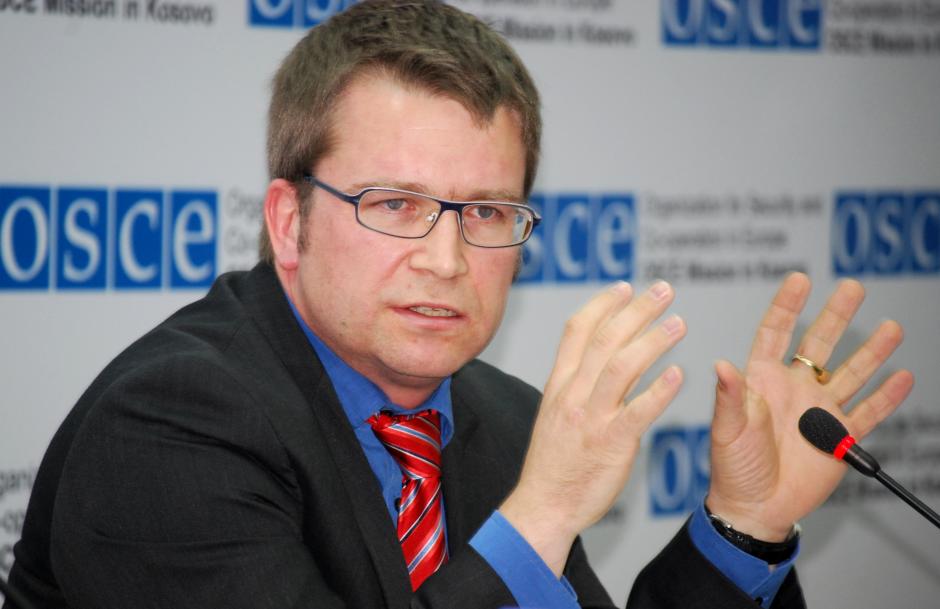 Wolff-Michael Mors, Acting Director of the OSCE Mission in Kosovo's Department of Human Rights and Communities, presents the assessment report on the participation of non-majority communities in municipal structures to media, Pristina, 3 December 2009.