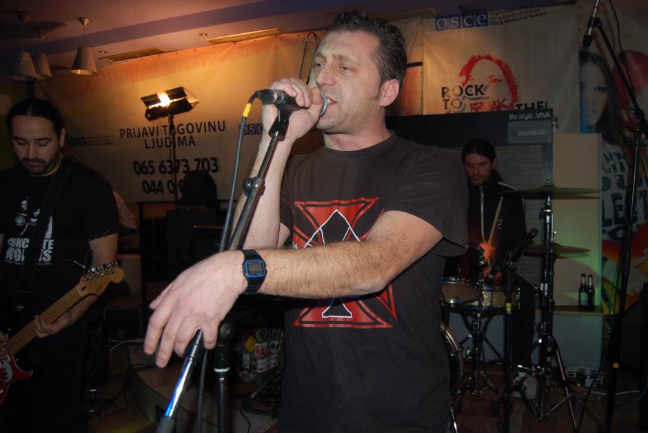 A band performs at a "Rock to break the silence 2! Report human trafficking!" concert to promote Kosovo's anti-trafficking helpline, Mitrovice/Mitrovica, 5 December 2009.