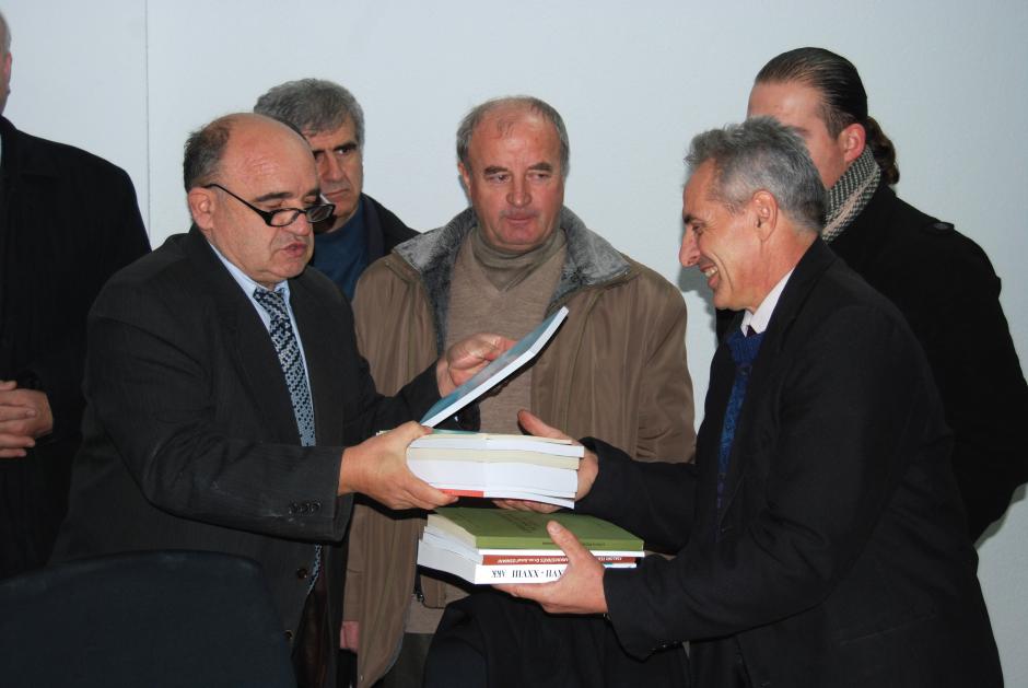 Jusuf Osmani (l) Chief Executive of the Kosovo Archive Agency hands over guide books on archiving to Ibish Gervalla, manager of the Decan/Decane Municipal Archive, at its inauguration ceremony, Decan/Decane, 22 December 2009.