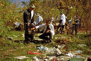 School students in Kosovo collect litter in a field as part of the