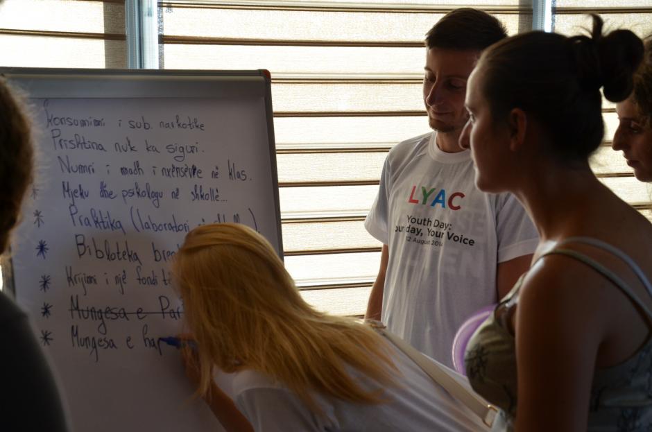 Members of Local Youth Action Councils took turns in writing down each-others’ concerns and priorities at the OSCE Mission in Kosovo supported events to mark the International Youth Day and promote participation of young people in decision making, Prishtinё/Priština, 12 August 2014.