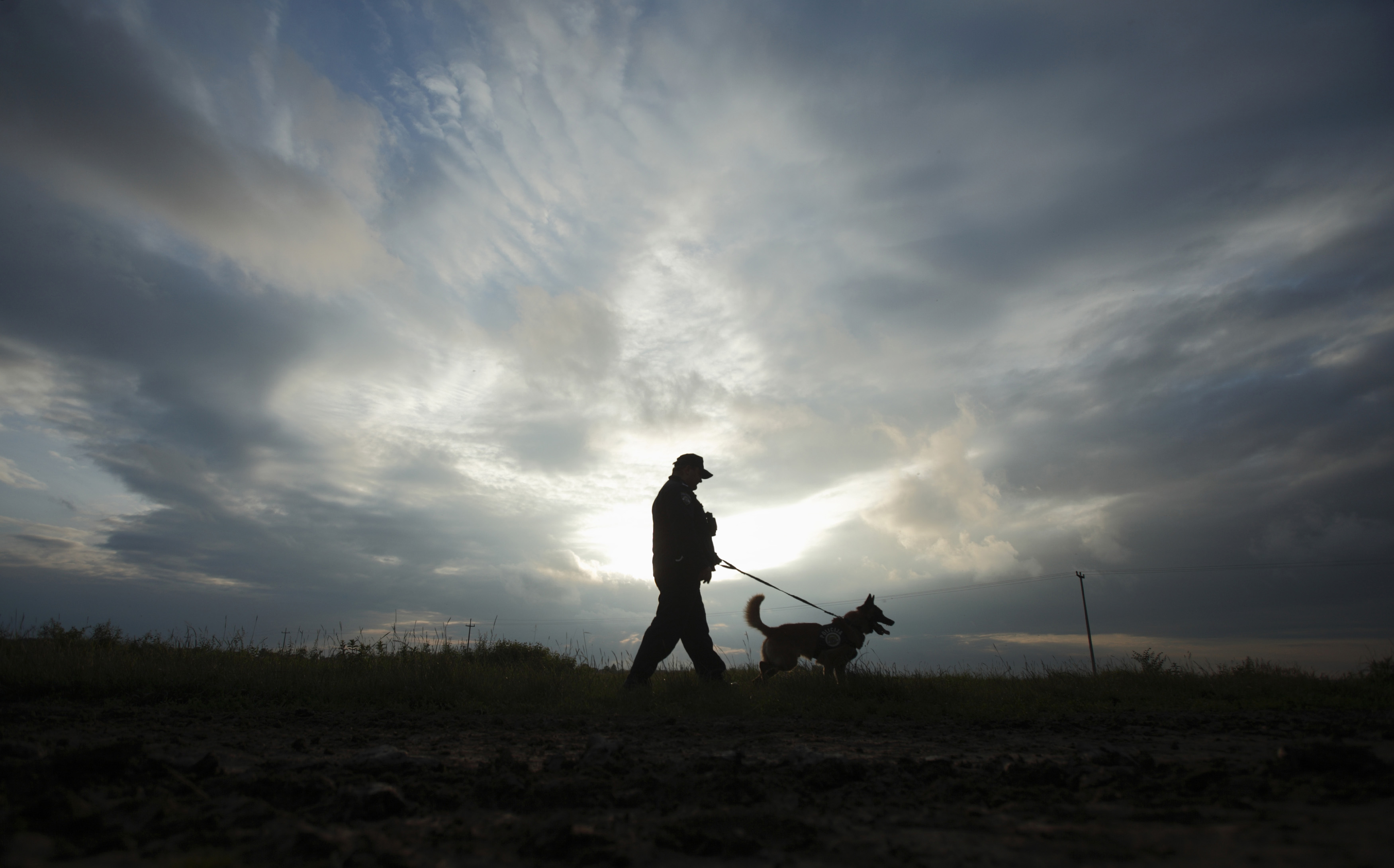 A border police officer and his dog patrol the area near the Croatia-Serbia border in Nijemci, east Croatia, 5 June 2013.