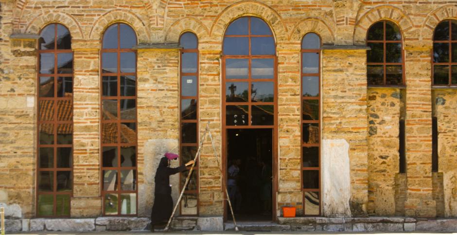 A nun working to preserve the Serbian Orthodox Monastery of Gračanica.