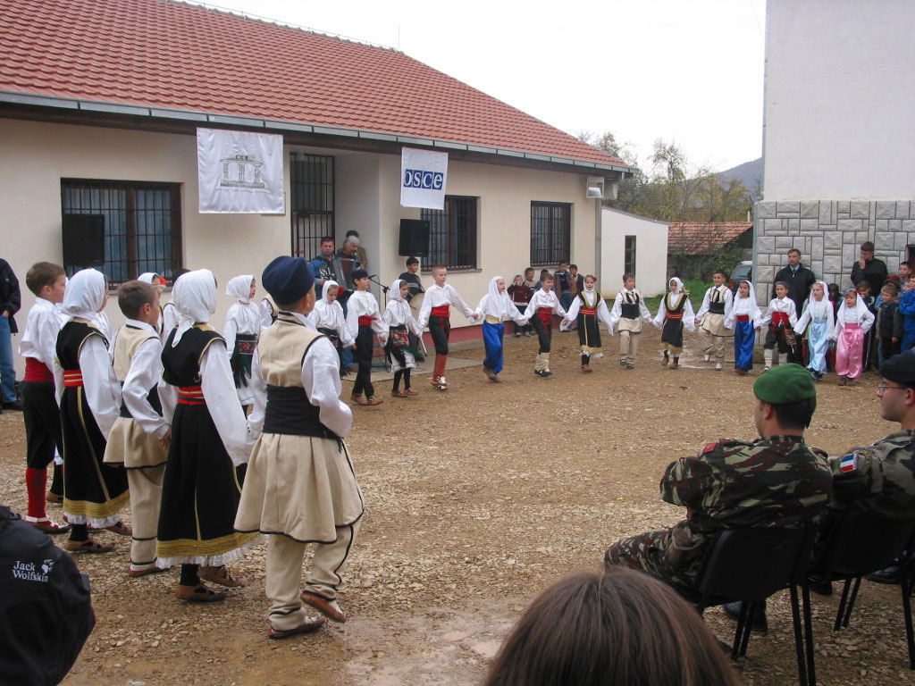 Young members of the folk group 'Mokra Gora' dancing at the opening ceremony of the Community Centre in Zubin Potok, November 2003.