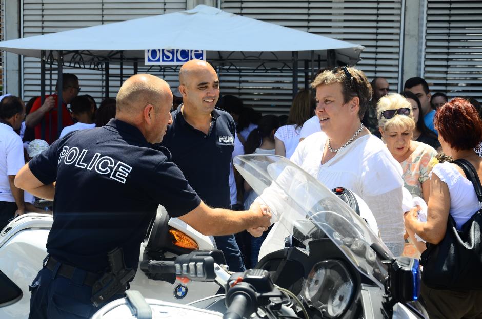Deputy Head of the OSCE Mission in Kosovo, Paivi Nikander, greets Kosovo Police officers who assisted with the OSCE Mission-supported Mini-Olympic Games, Vushtrri/ Vučitrn, 26 June 2016.