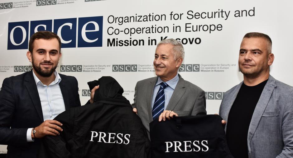 PRISHTINË/PRIŠTINA, 23 September 2016 – The outgoing Head of the OSCE Mission in Kosovo, Jean-Claude Schlumberger, hosted today the chairpersons of the Association of Journalists of Kosovo, Shkëlqim Hysenaj, and of the Journalists’ Association of Serbia registered in Kosovo, Budimir Ničić, to donate 50 sets of vests and jackets bearing the word ‘PRESS’.