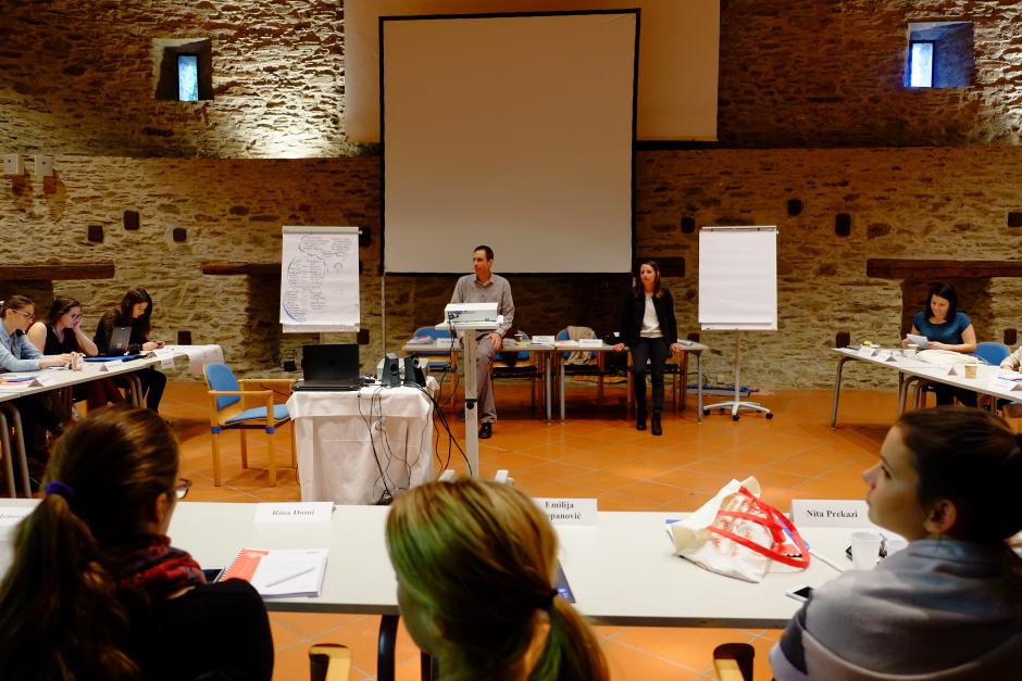 Thomas Mühlmann and Astrid Holzinger of the Austrian Foreign Ministry address the participants during their visit to the Academy. Speakers discussed the priorities of the upcoming OSCE Chairmanship on youth and women in peace-building, as Austria prepares to take over OSCE Chairmanship in 2017, Stadtschlaining, Austria, 5 October 2016.