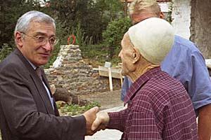 Head of Mission Pascal Fieschi visits new returnees to Biti e Epërme/Gornja Bitinja in Kosovo, July 2003.