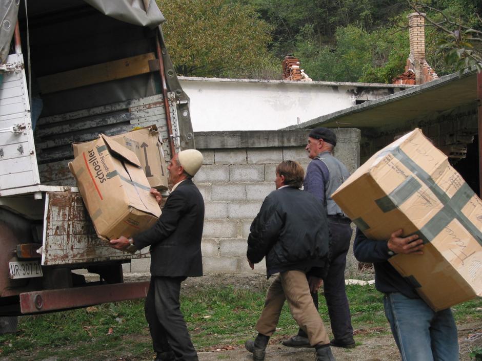 Aid is delivered to returnees in Biti e Eperme/Gornja Bitinja, Kosovo, November 2003.