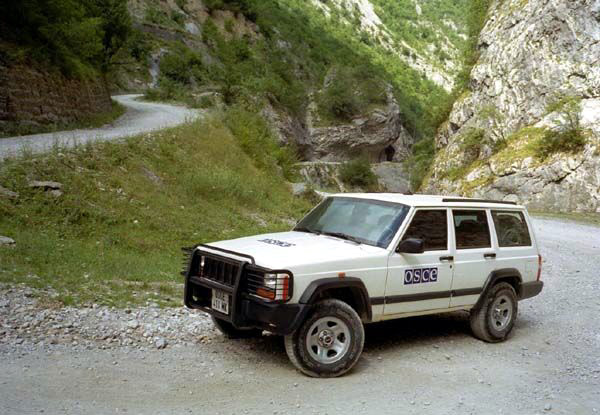 Mission members in an OSCE vehicle on a mountain road. The OSCE Mission in Kosovo maintains a presence in all of Kosovo's thirty municipalities.