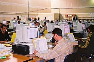 OSCE staff tabulate the results of the 2004 Kosovo Assembly Elections at a counting centre in Fushe Kosova/ Kosovo Polje, 24 October 2004.
