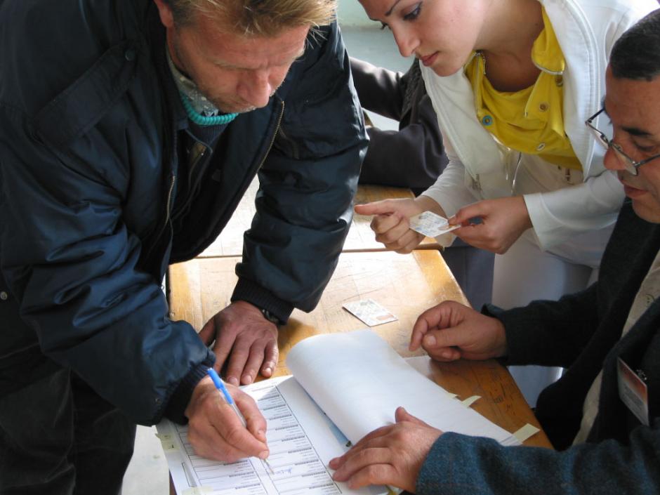 A voter has his eligibility information verified at a polling station in Suhareka/Suva Reka on Kosovo's Assembly Election day, 23 October 2004.