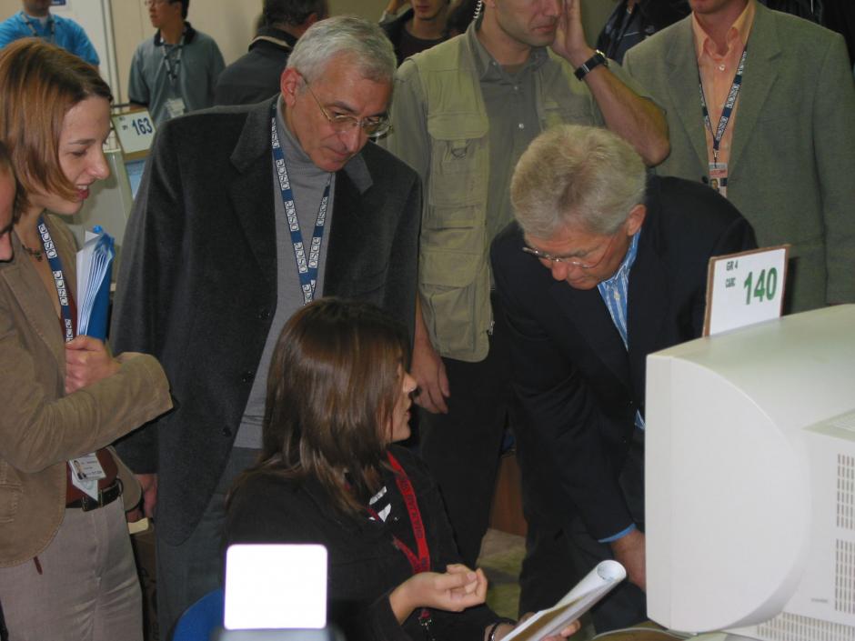 Head of OSCE Mission Pascal Fieschi (left) and UN Special Representative to the Secretary General, Soren Jessen-Petersen, visit an OSCE Election Counting Centre in Fushe Kosova/Kosovo Polje, 24 October 2004.