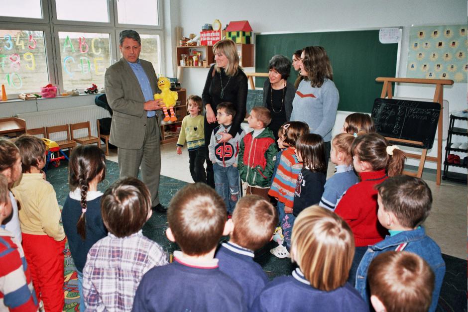President of the "Sesame Street Workshop" Gary Knell visiting pre-school children, the target audience for Sesame Street Show, at "7 Marsi" Elementary School in Prishtina, 9 November 2004.