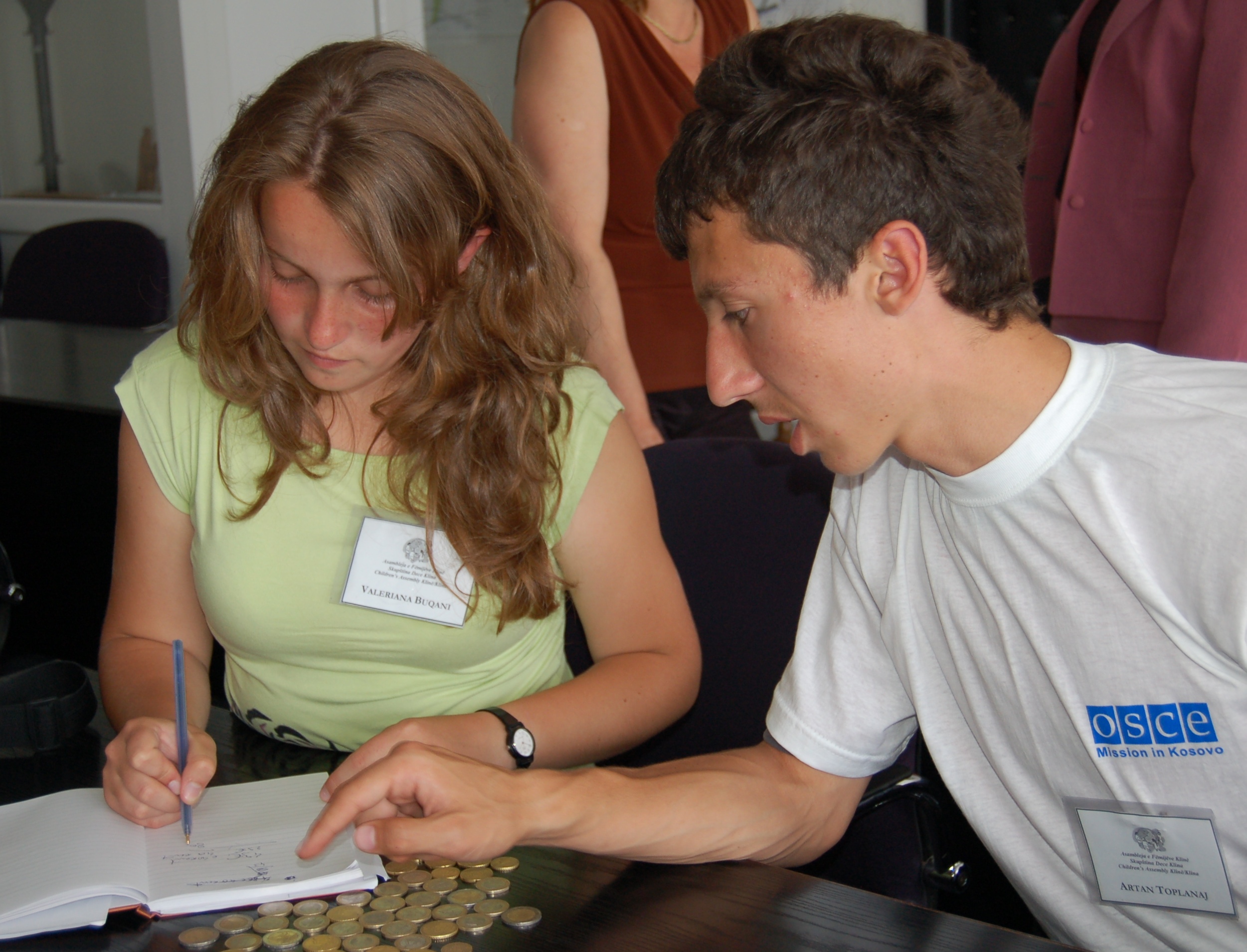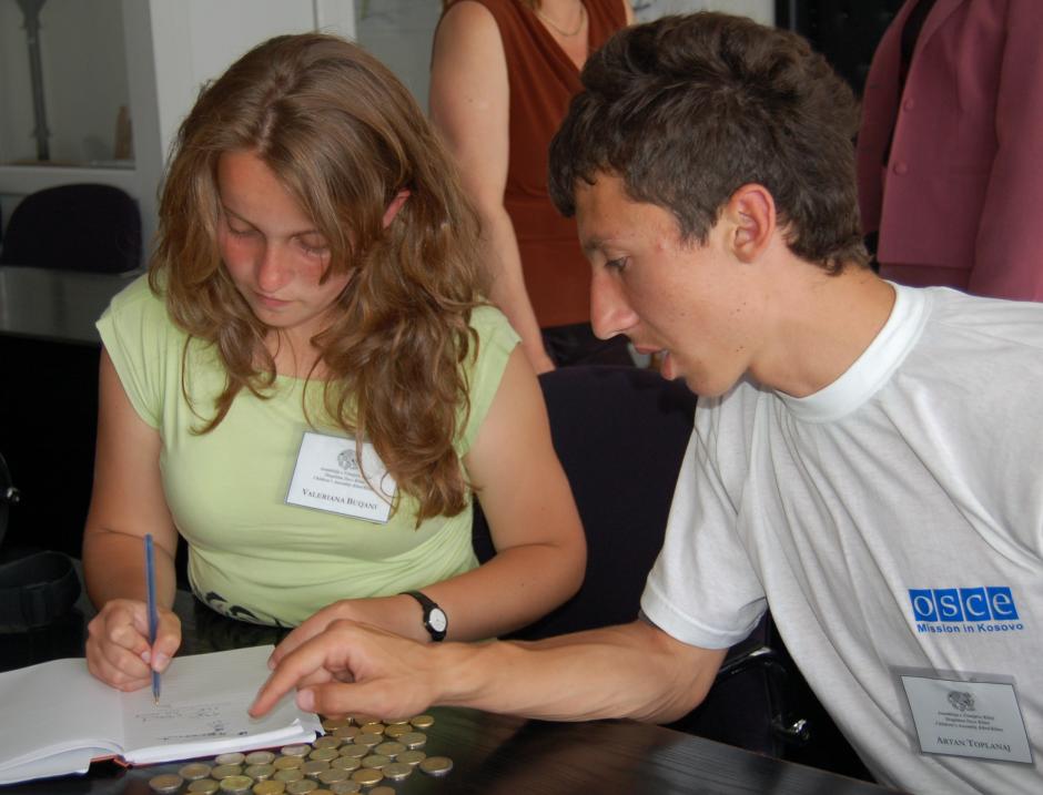 Valeriana Buqani (left) and Artan Toplanaj of the Kline/Klina children's assembly tally their earnings after a fund-raising event supported by the OSCE Mission to Kosovo on the International Day of the Child, 1 June 2006.