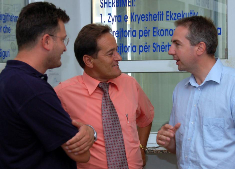 Oliver Bricet (right) and Kreshnik Basha (left), members of an OSCE Municipal Team, talk to Haki Krasniqi, Director of the Public Administration Sector in Malisheve/Malisevo Municipality, during a daily visit, 10 August 2006.