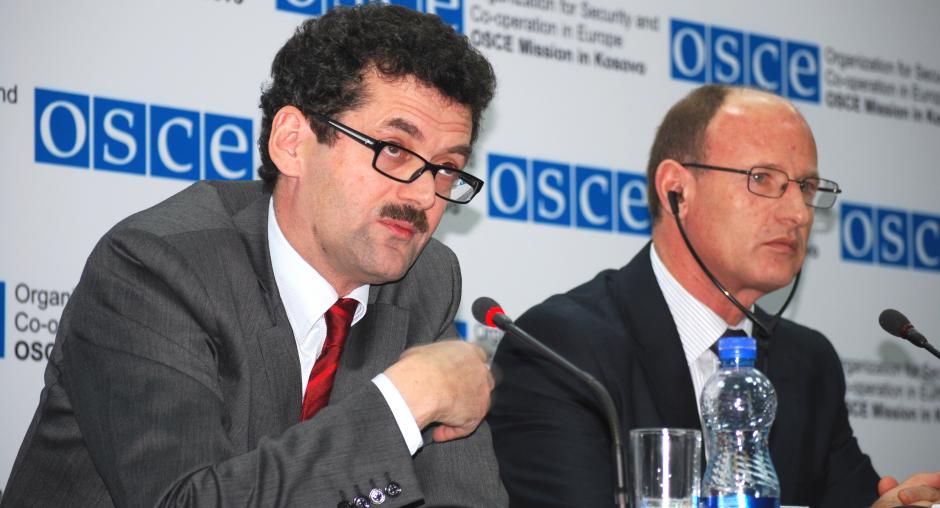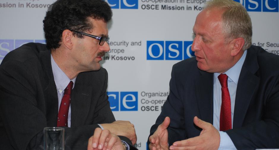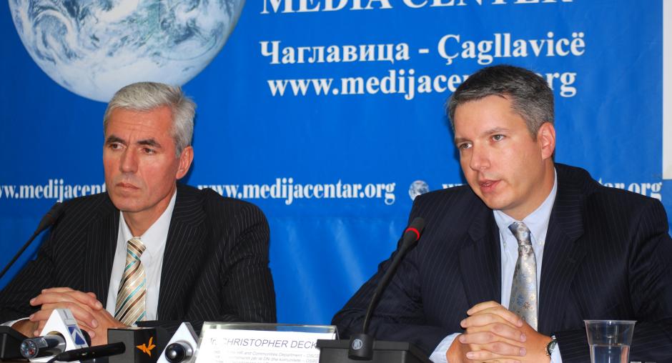 Christopher Decker, Director of the OSCE Mission in Kosovo's Human Rights and Communities Department (r), and Sami Kurteshi, Kosovo's first local Ombudsperson, during a joint press conference at the media centre in Gracanica/Gracanice, 8 September 2009. (OSCE/Hasan Sopa)