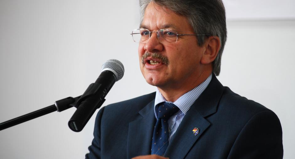 German Ambassador Hans-Dieter Steinbach speaks at a handover ceremony for equipment donated by his government to the Security and Public Safety Agency in Kosovo, Vushtrri/Vucitrn, 20 July 2009. (OSCE/Hasan Sopa)