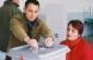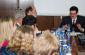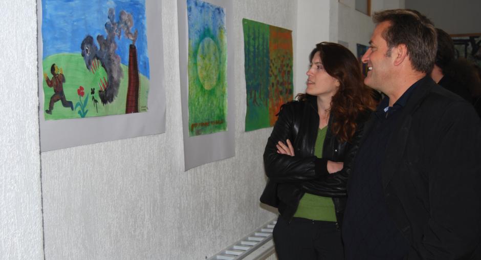 Salih Elshani and Violeta Demaj of the OSCE municipal team in Suharekë/Suva Reka municipality at an exhibition of drawings by the students of Jeta Re secondary school, part of the Kosovo Mission's activities to mark Earth Day, 22 April 2009. (OSCE/Hasan Sopa)
