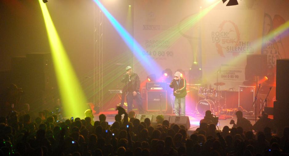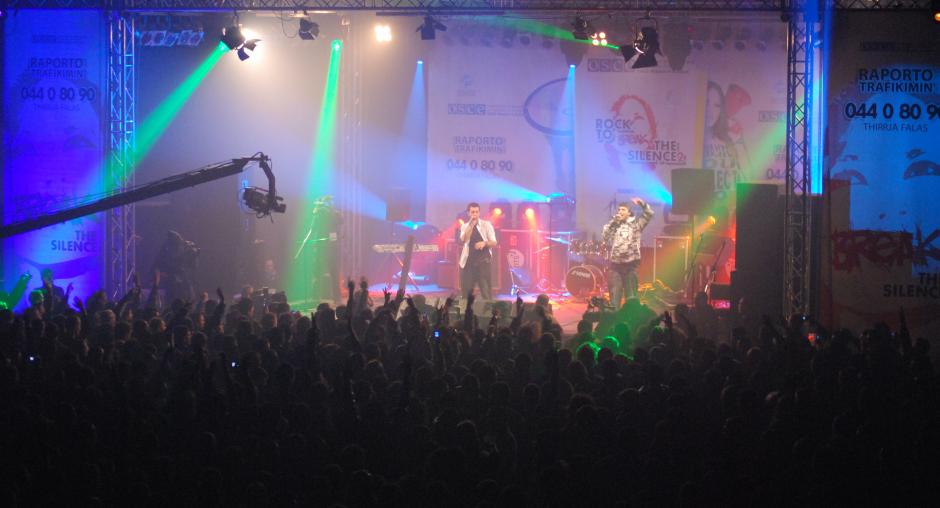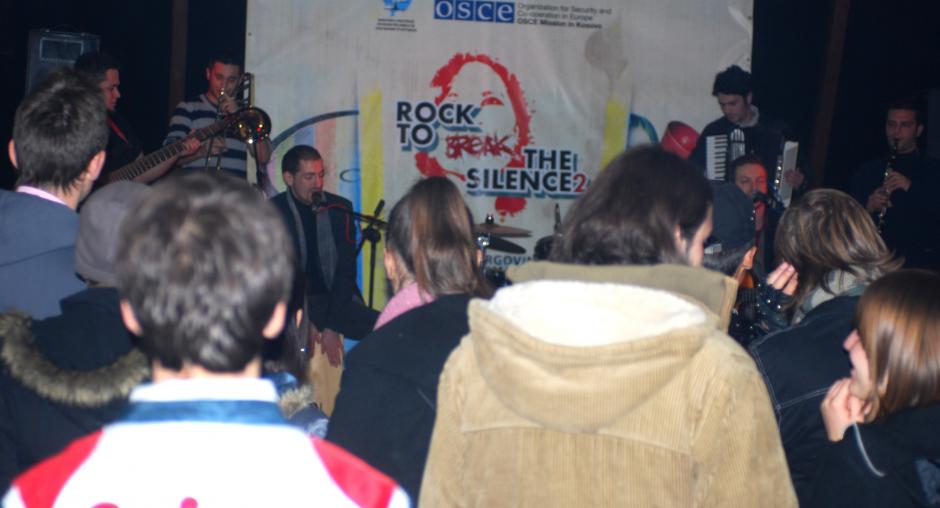 Participants at a "Rock to break the silence 2! Report human trafficking!" concert, supported by the OSCE Mission to promote Kosovo's anti-trafficking helpline, Mitrovice/Mitrovica, 5 December 2009. (OSCE/Nikola Gaon)