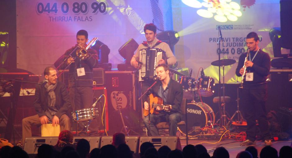 A band performs at a "Rock to break the silence 2! Report human trafficking!" concert to promote Kosovo's anti-trafficking helpline, in Prizren, 4 December 2009. (OSCE/Hasan Sopa)