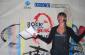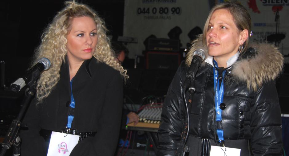 Vesa Luma, Kosovo rock star (l) and Caroline Stampfer, Chief of the OSCE Mission in Kosovo's Anti-trafficking Unit, promote Kosovo's anti-trafficking helpline at the "Rock to break the silence 2!" press conference, Prishtine/Pristina, 10 December 2009. (OSCE/Besfort Oruci)
