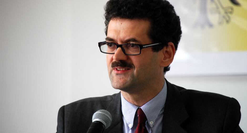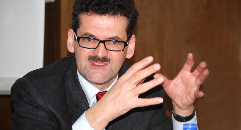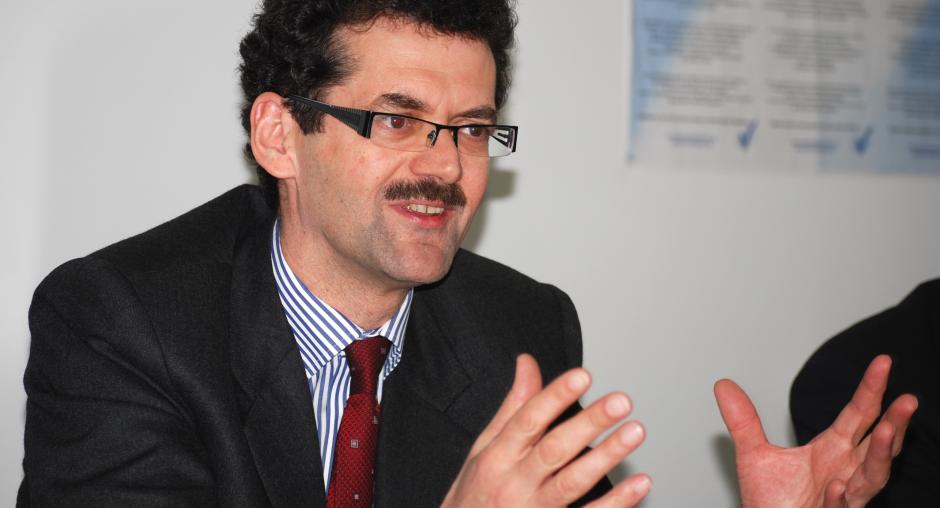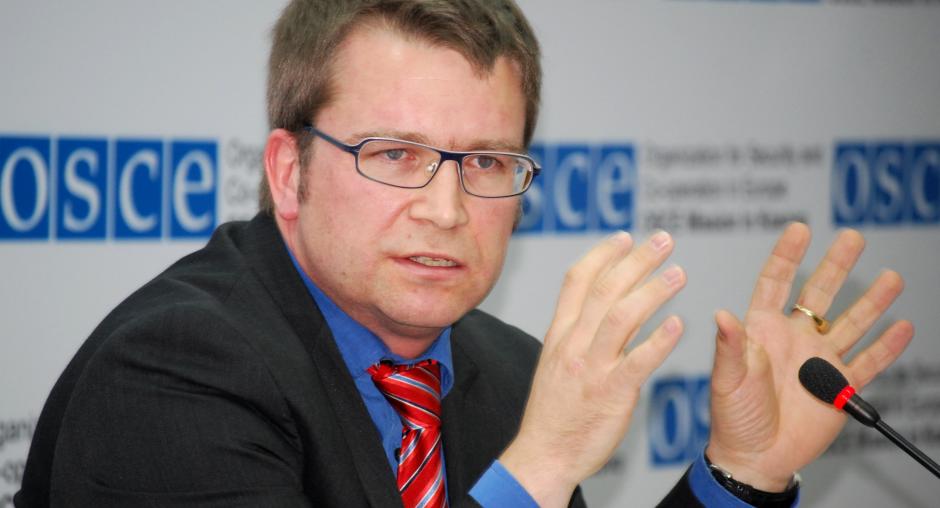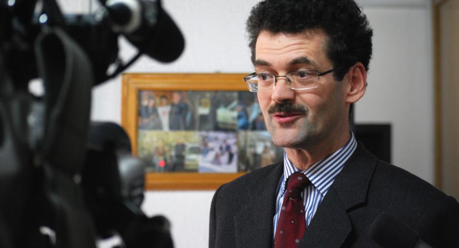 Wolff-Michael Mors, Acting Director of the OSCE Mission in Kosovo's Department for Human Rights and Communities, talks to the media about the findings of a Mission report on detention in criminal proceedings, 15 March 2010. (OSCE/Hasan Sopa)