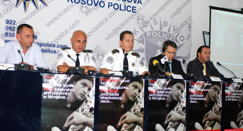 Michael Mors (r), deputy director of the OSCE department for human rights and communities, and Kosovo police representatives talk to the media at the launch of an OSCE-sponsored campaign to combat child begging, Prishtine/Pristina, 9 October 2009. (OSCE/Hasan Sopa)