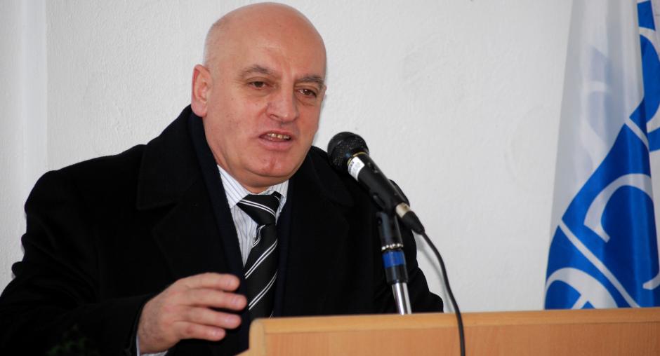 Faruk Kukaj, co-ordinator of the Handikos office in Prishtine/Pristina, thanks the OSCE Mission and the municipality for opening the new Handikos office within the municipal building of Fushe Kosove/Kosovo Polje at a handover ceremony, 4 February 2010. (OSCE/Hasan Sopa)