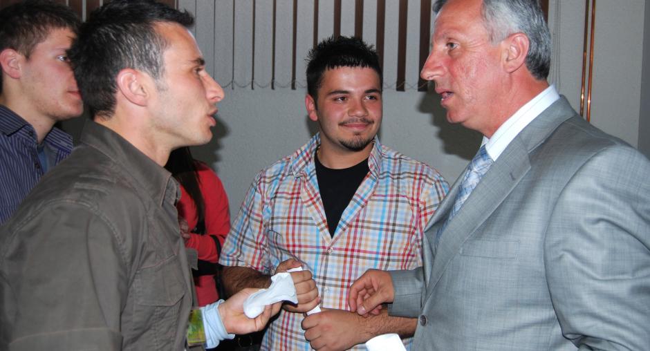 The Mayor of Gjilan/Gnjilane Municipality, Qemajl Mustafa (r), talks to members of the Human Rights Club from Gjilan/Gnjilane at a photo exhibition supported by the OSCE Mission in Kosovo, 27 April 2009. (OSCE/Hasan Sopa)