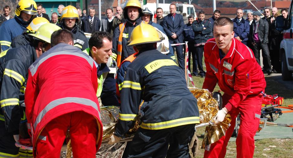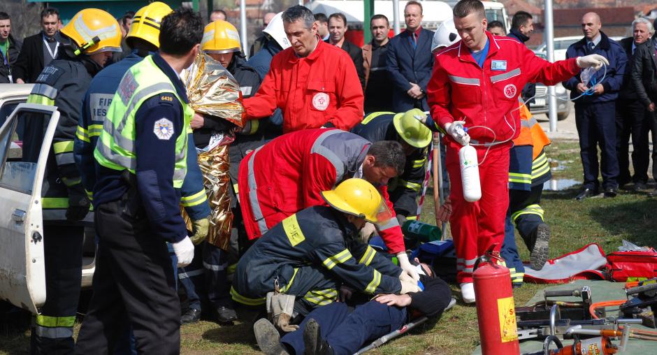 The Kosovo Police Service and Fire Rescue Service simulate a traffic accident after the handover of OSCE-donated first aid bags to the Fire and Rescue Station in Vushtrri/Vucitrn, 9 March 2009. (OSCE/Hasan Sopa)