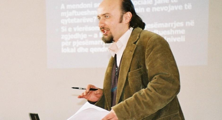 OSCE Democratization Officer Vardon Hoxha facilitates a public discussion on Internal Security Sector Review, a programme aimed at assessing the short and long term development needs of Kosovo's security sector, Lipjan/Lipljan, 1 March 2006. (OSCE/Dillon Case)