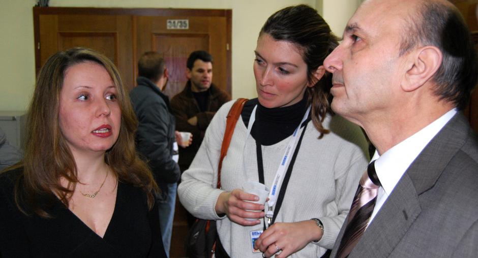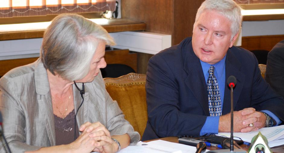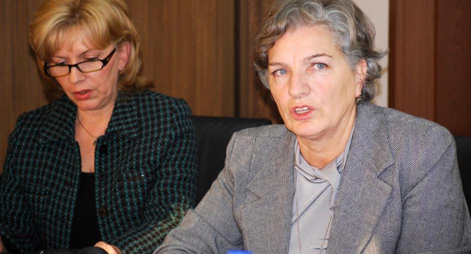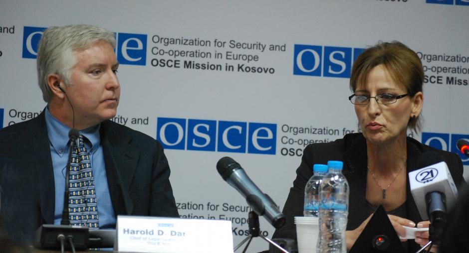 Lirije Osmani, President of the Kosovo Judicial Council (l) and Harold Dampier, chief of the OSCE Mission in Kosovo's Legal System Monitoring Section, at a roundtable on a Mission report on problems as a result of not enough judges, 24 September 2009. (OSCE/Hasan Sopa)