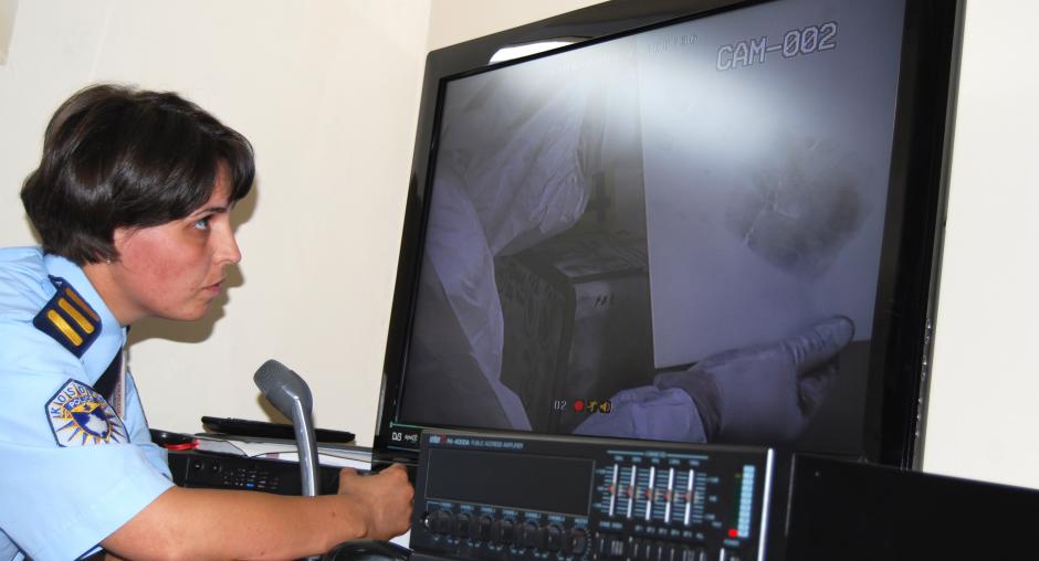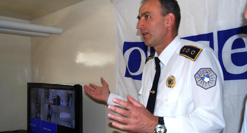 A Kosovo police service officer explains the importance of the newly equipped crime scene simulation room for the work of the police at the ceremony in which it was handed over to the Kosovo authorities, Vushtrri/Vucitrn, 17 June 2009. (OSCE/Hasan Sopa)