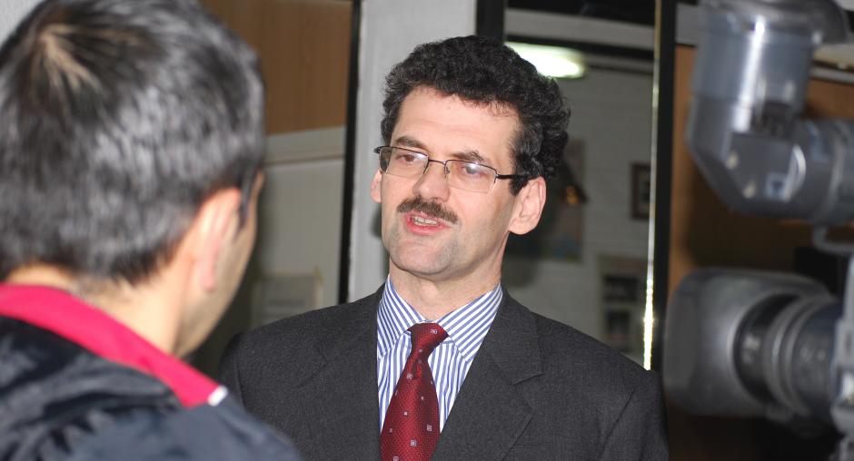 Markku Laamanen, Deputy Head of the OSCE Mission, talks to the media about the Mission's work on the issues of domestic violence, Prishtine/Pristina, 25 November 2009. (OSCE/Hasan Sopa)